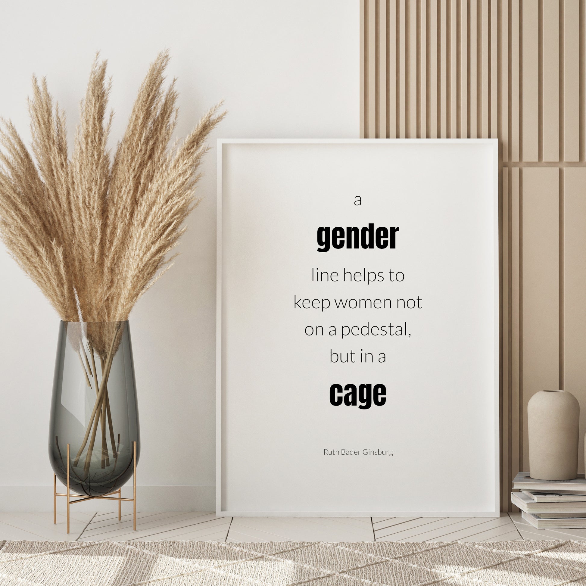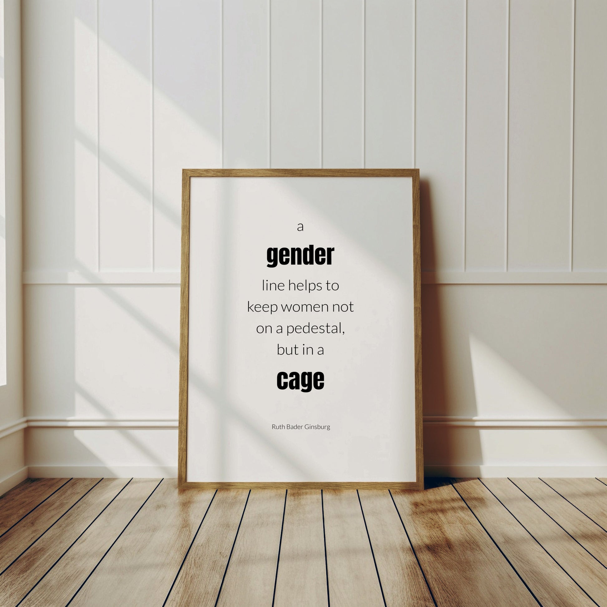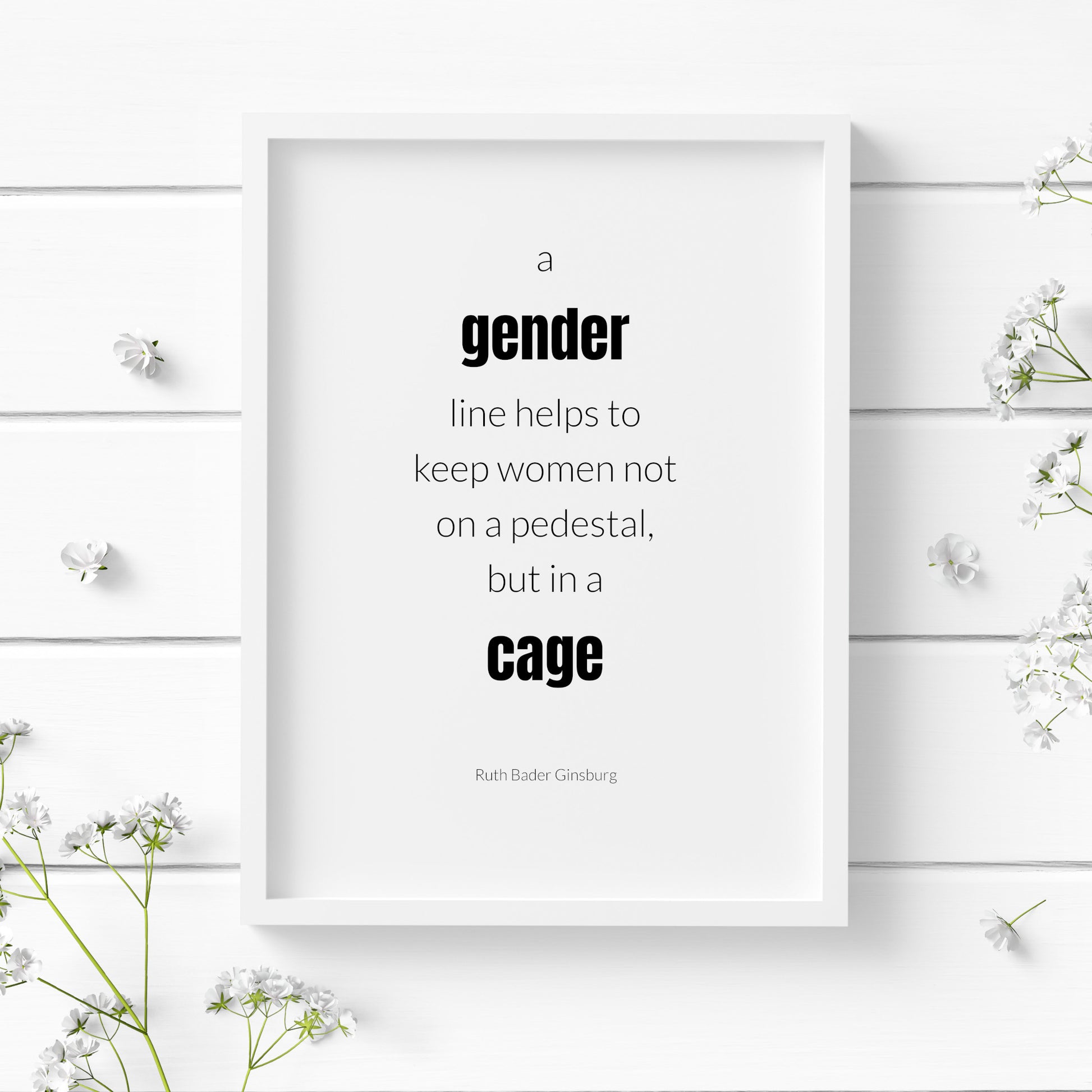 Quote reads "A gender line helps to keep women not on a pedestal, but in a cage - Ruth Bader Ginsburg".