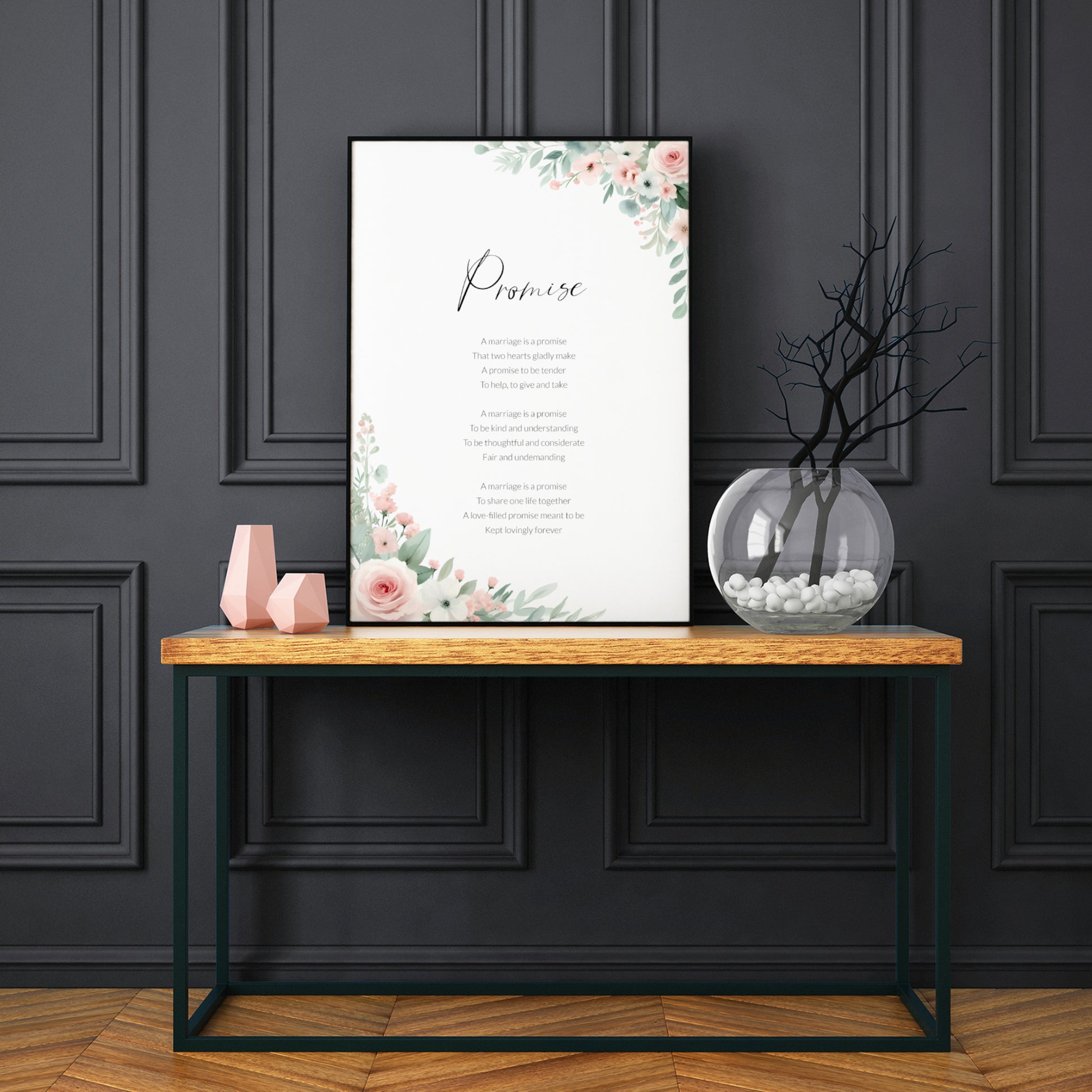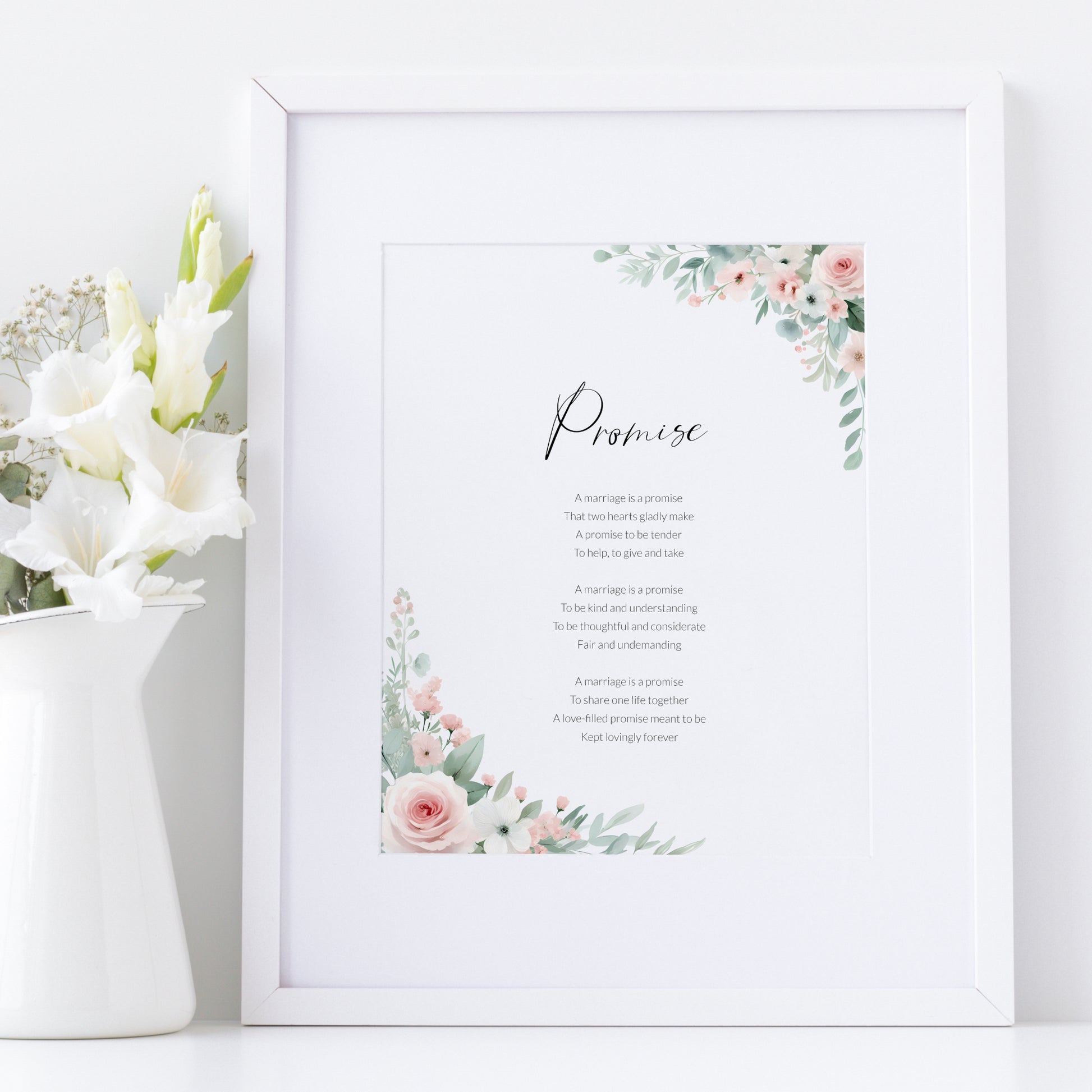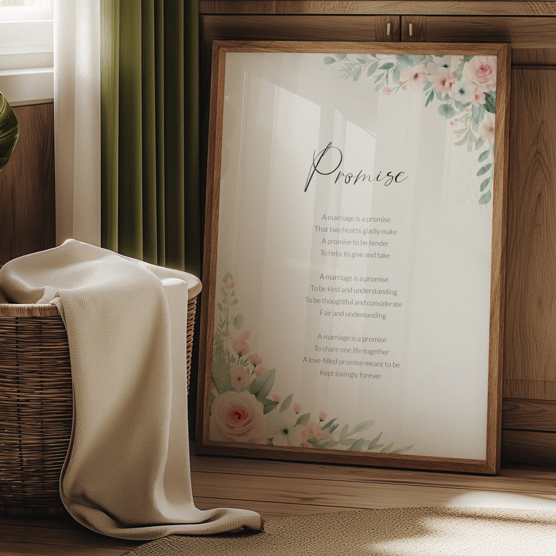 Promise is a wonderfully romantic poem that captures the true essence of commitment in marriage, and with this stunningly elegant print, you can cherish it for a lifetime. It is a great gift option for lots of occasions, including weddings and anniversaries, especially if you chose this classic piece as your wedding reading. Remember paper is the traditional first wedding anniversary present…