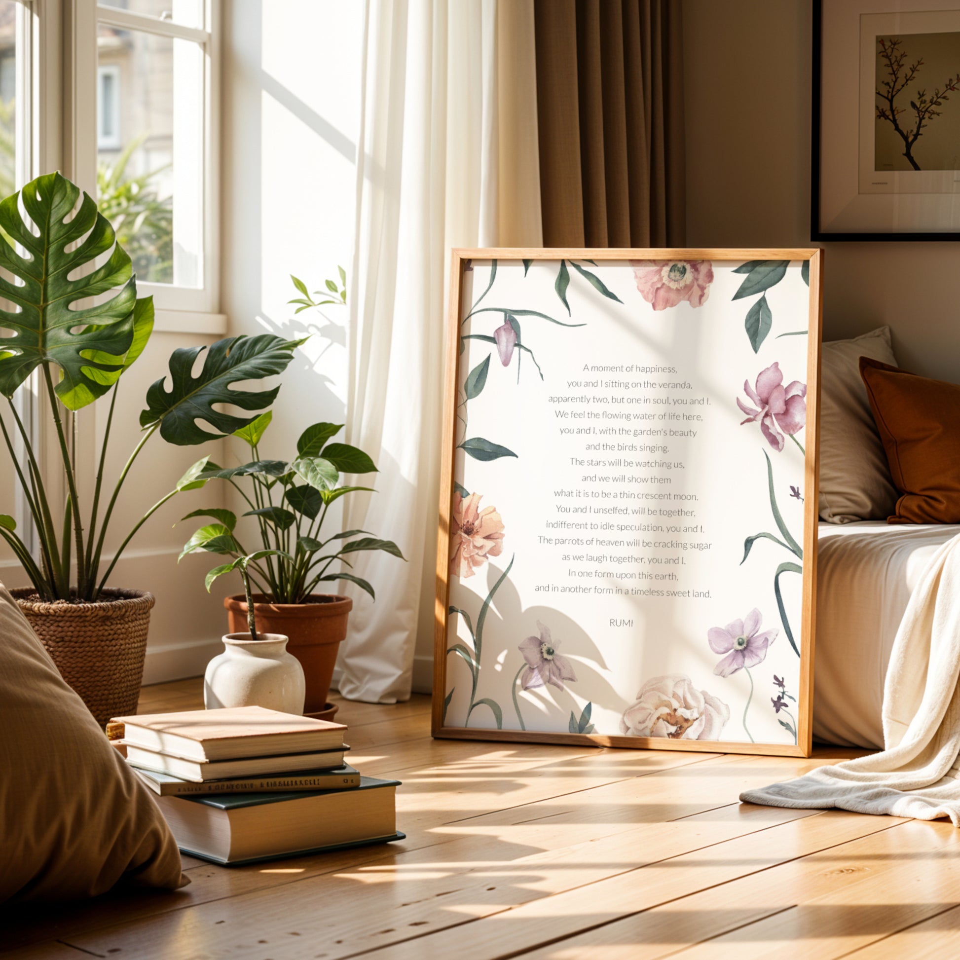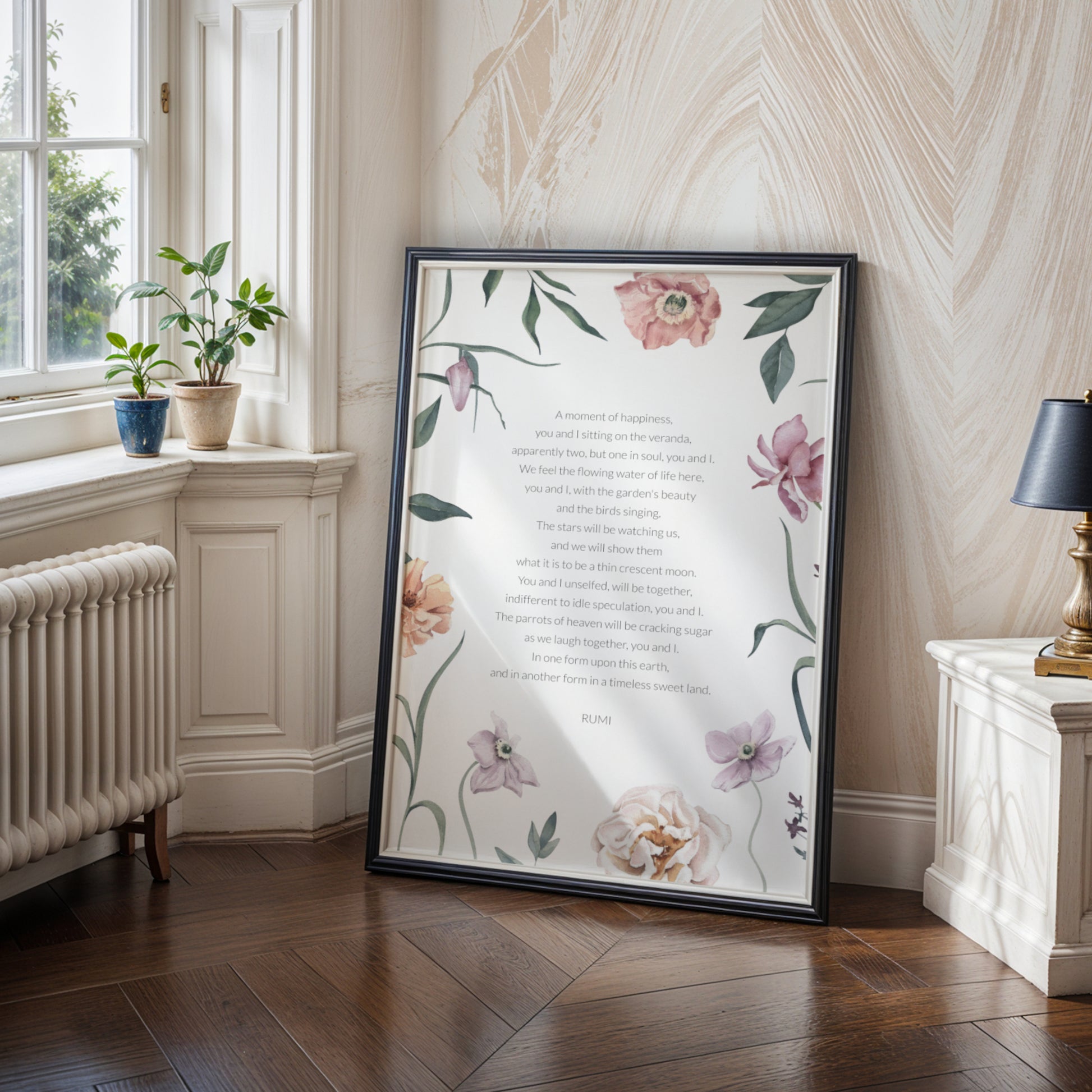 Featuring Rumi’s wonderfully romantic poem “A Moment of Happiness”, this beautiful print captures the essence of true love and spiritual connection. Surrounded by delicate watercolour florals, it has a wonderfully calming and romantic aesthetic, making it the perfect choice for a master bedroom, reading nook, or conservatory.