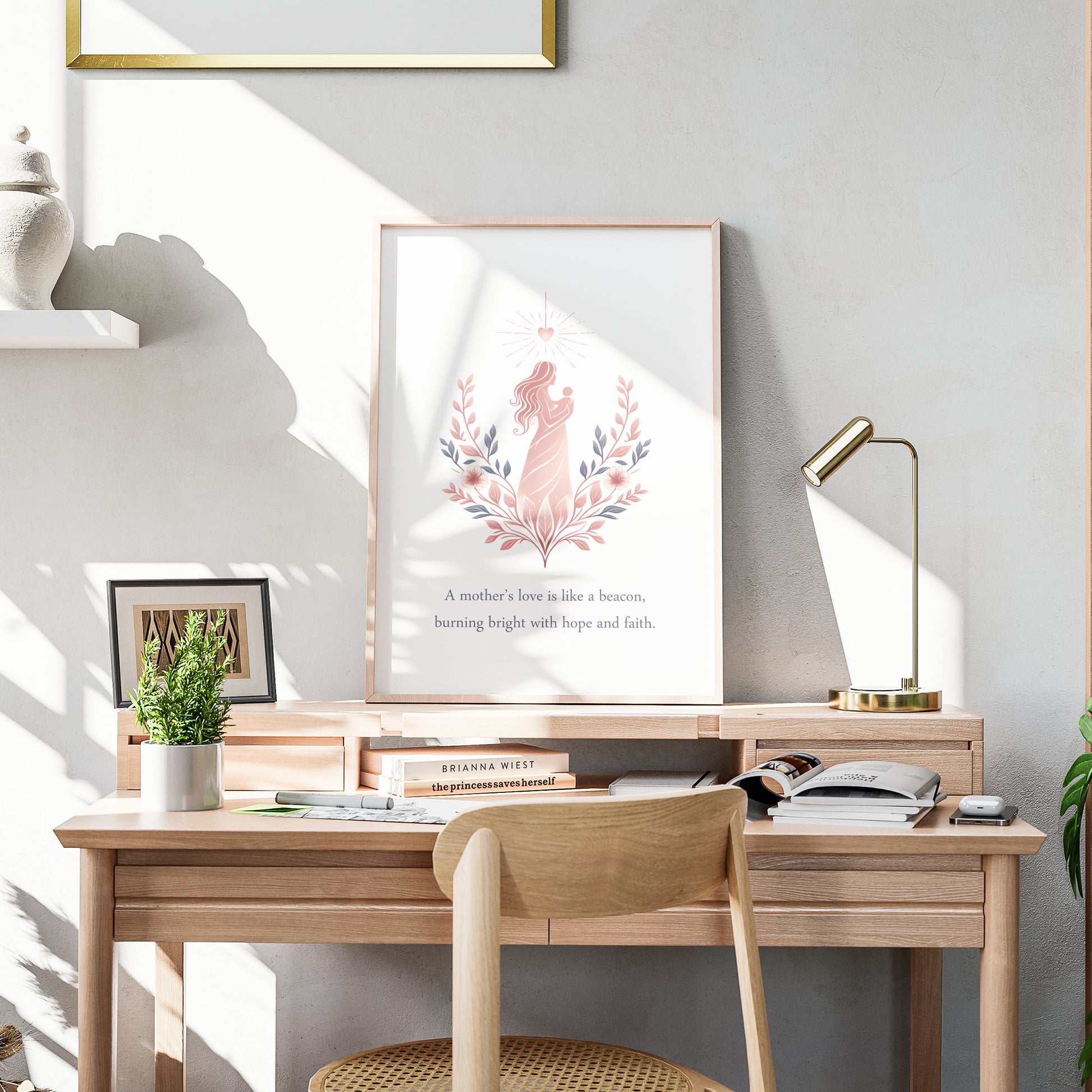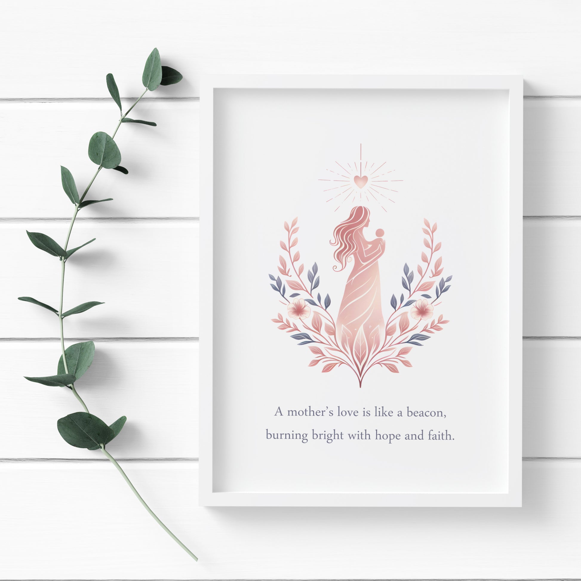 The beautiful print captures the essence of a mother's love in a timeless and meaningful way. Featuring the quote "A mother’s love is like a beacon, burning bright with hope and faith.", it is the perfect gift for a birthday or for Mother's Day if you want to express your gratitude and admiration for an incredible mum who lights up your life with her love.