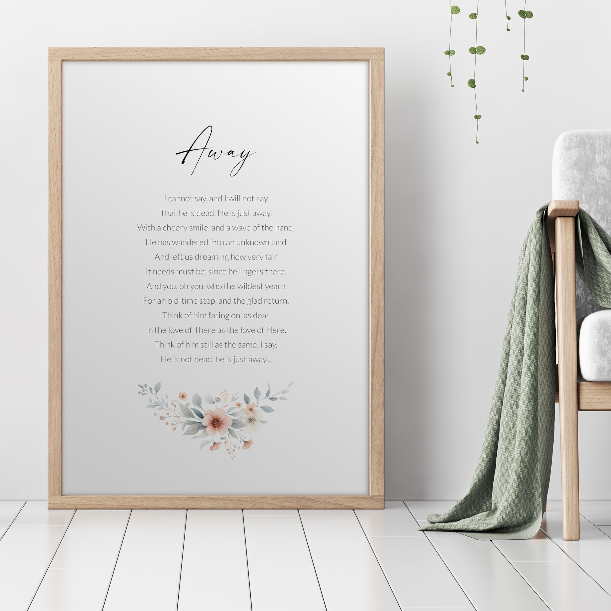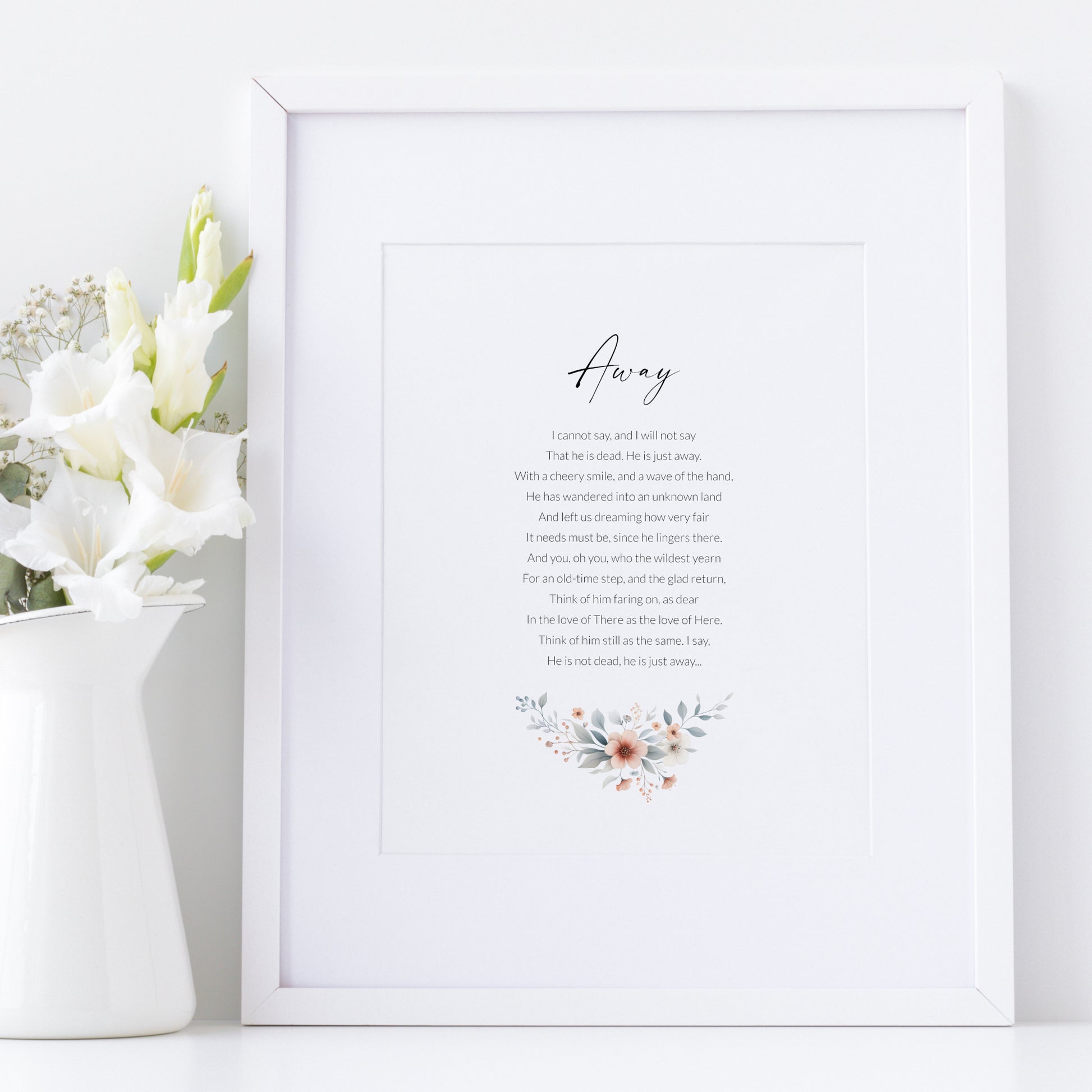 This beautiful print features the timeless poem "Away" by James Whitcomb Riley, a poignant piece that captures the essence of loss and the journey beyond. It is the perfect sympathy gift, offering solace and comfort to those who are grieving. A touching reminder of the enduring love and cherished memories shared with those who have passed "Away", it is a treasure to hold close in moments of reflection and remembrance. Its elegant design and powerful words also make it a thoughtful keepsake from a memorial where it was the chosen funeral reading, honouring the memory of a loved one with grace and beauty.