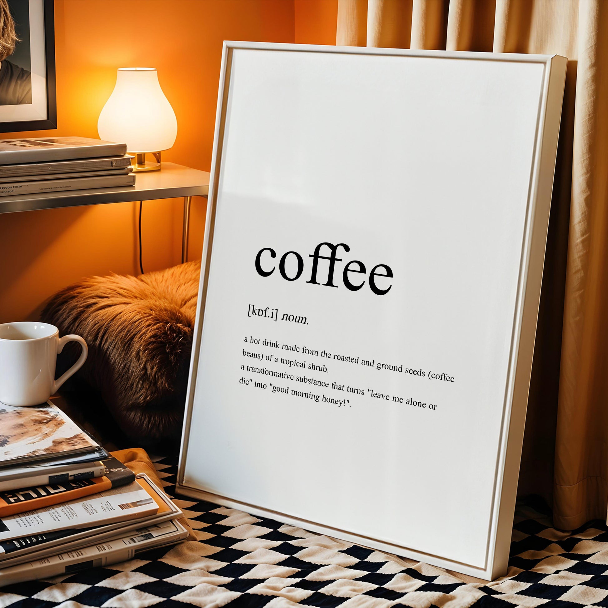 This playful coffee definition print combines a classic dictionary-style description with a tongue-in-cheek modern twist. It will add a touch of everyday humour to any kitchen, coffee station, dining space, bedroom or home office.