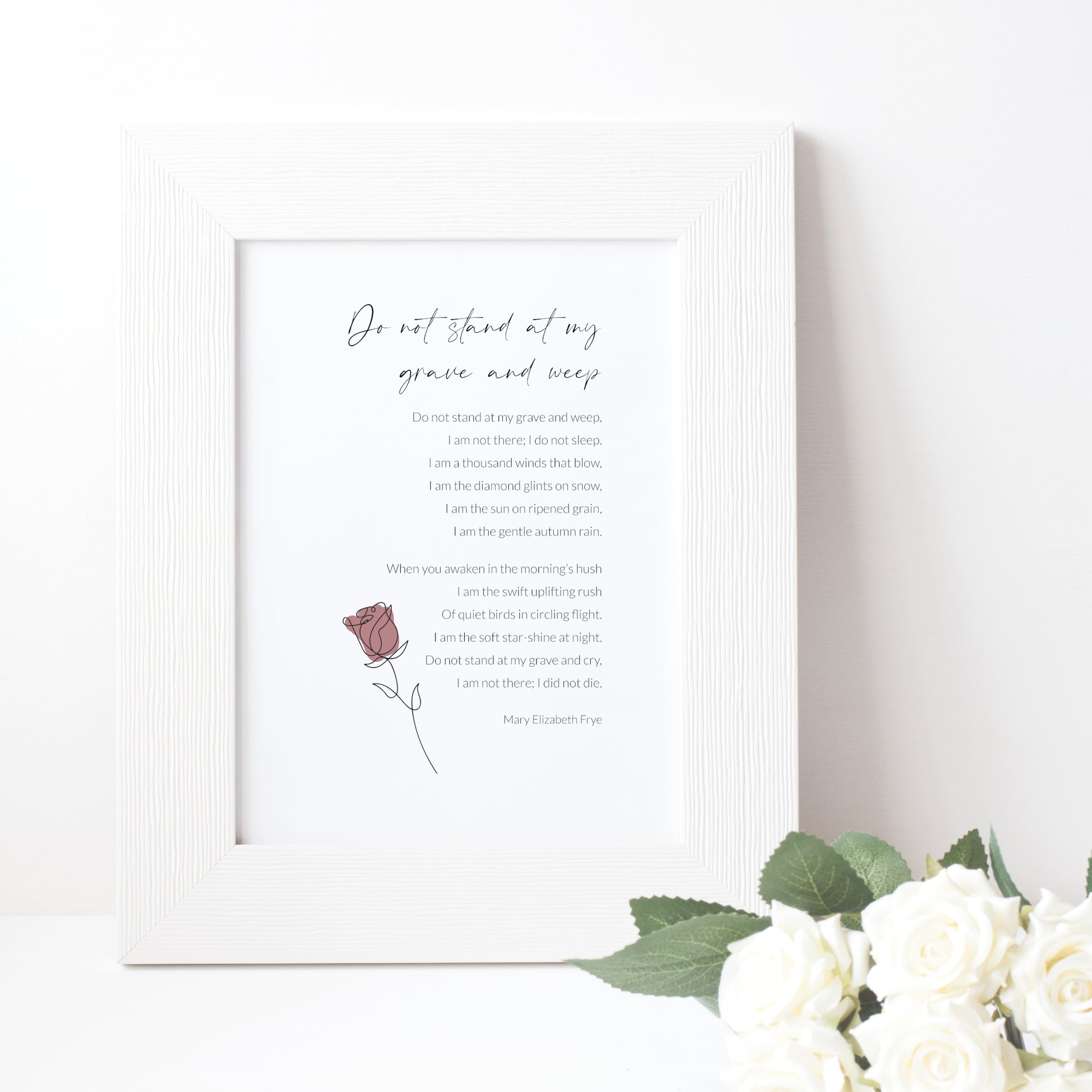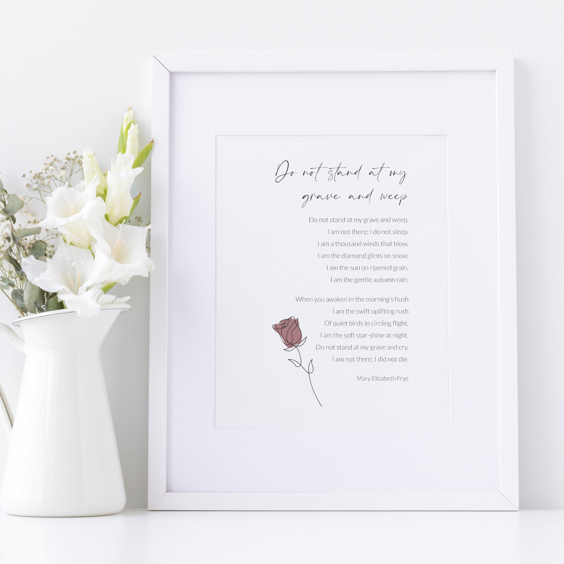 This delicate print features the beautiful poem Do Not Stand At My Grave And Weep by Mary Elizabeth Frye. It is a lovely reminder that our loved ones are always with us. It would make a lovely addition to any home, or if you need a sympathy gift, these words provide the perfect comfort.