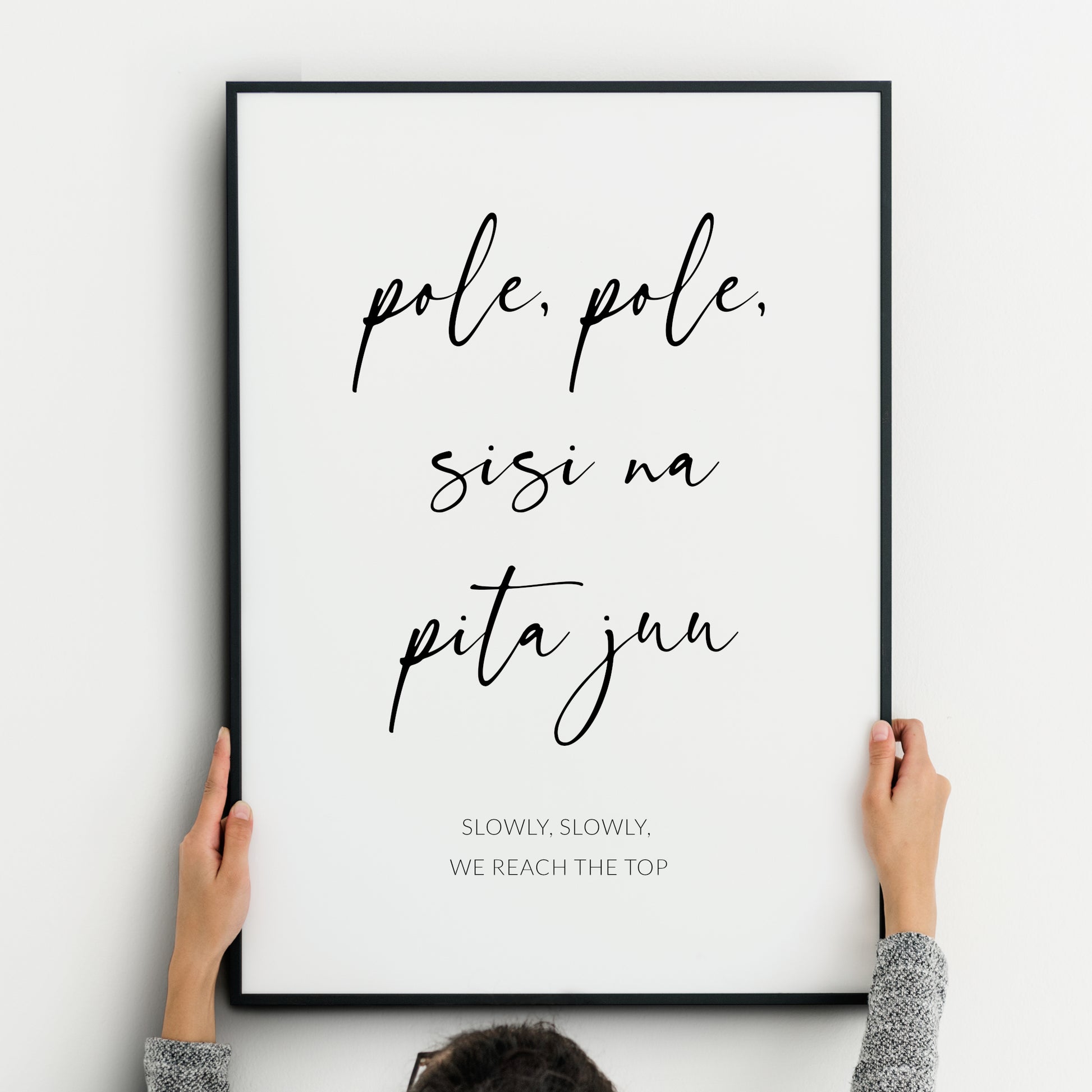 This elegant print showcases the inspiring Swahili quote "Pole, Pole, Sisi Na Pita Juu" which translates to "Slowly, slowly, we reach the top". It is a wonderful reminder of the value of patience and perseverance in achieving one's goals. Ideal for home or office decor, it adds a touch of cultural richness, while encouraging a steady approach to success. It also makes a fabulous gift for lots of occasions.
