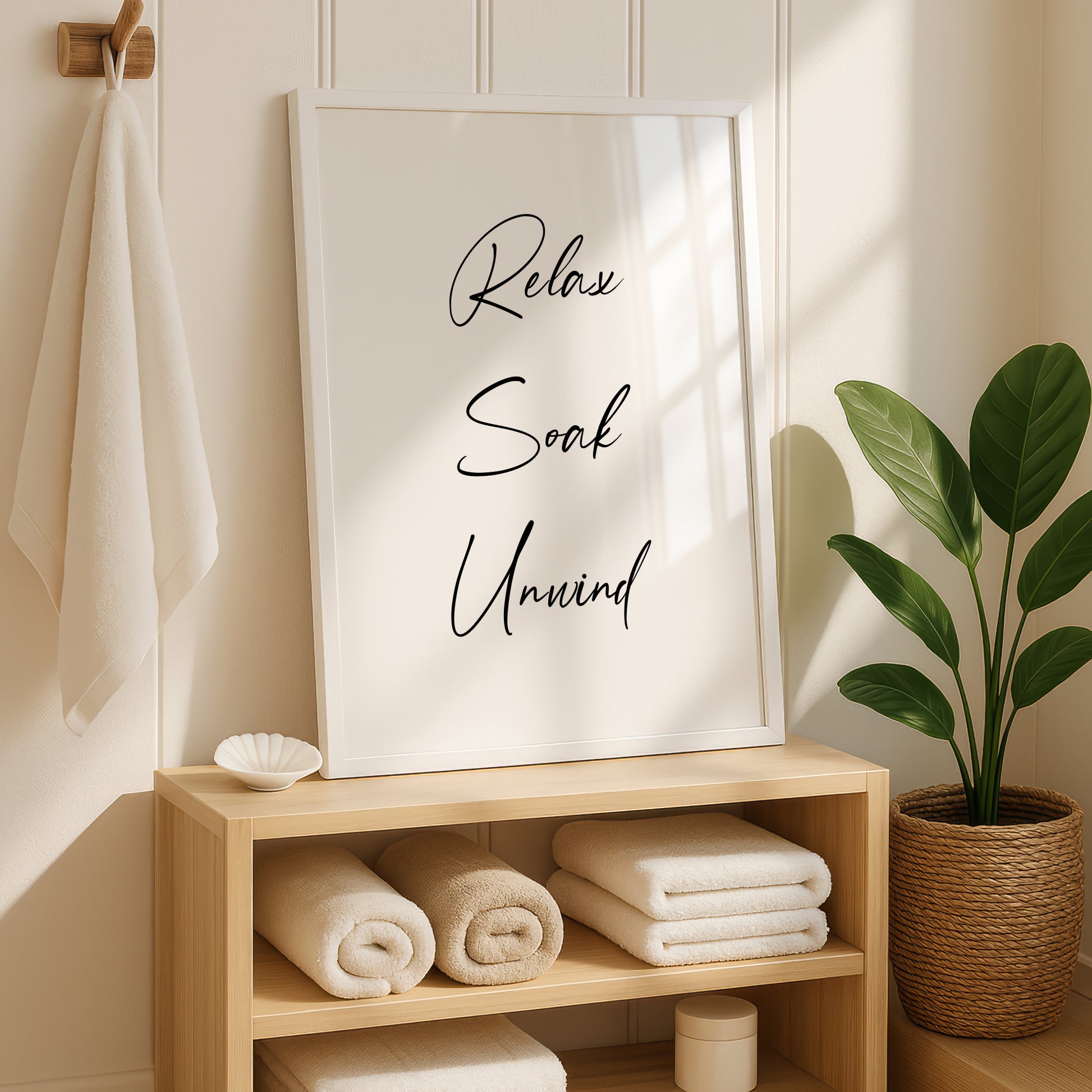 Transform your bathroom into a serene retreat with this stylish “Relax Soak Unwind” print. Featuring modern black typography on a crisp white background, this minimalist artwork will bring spa-like vibes and a calming atmosphere to your home.
