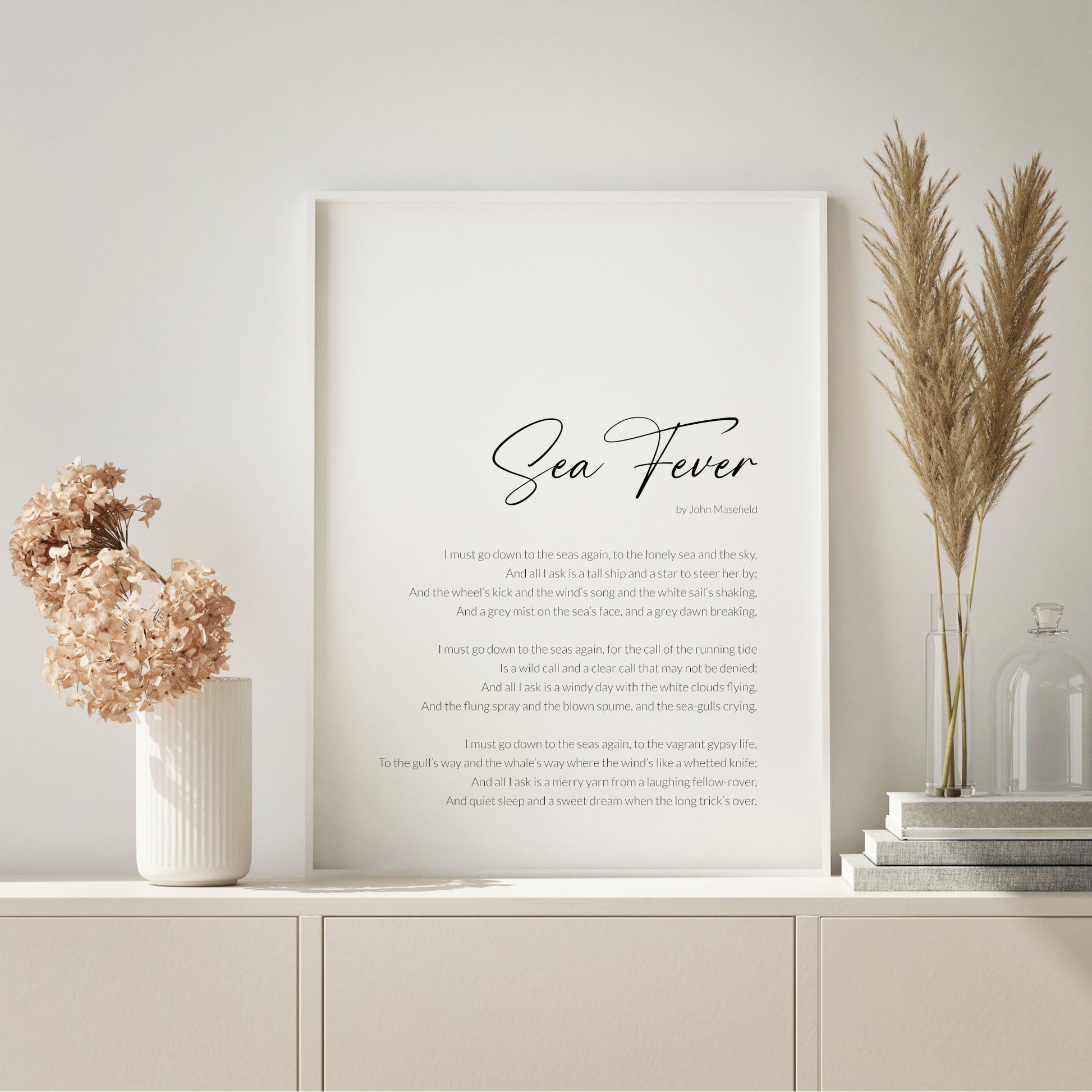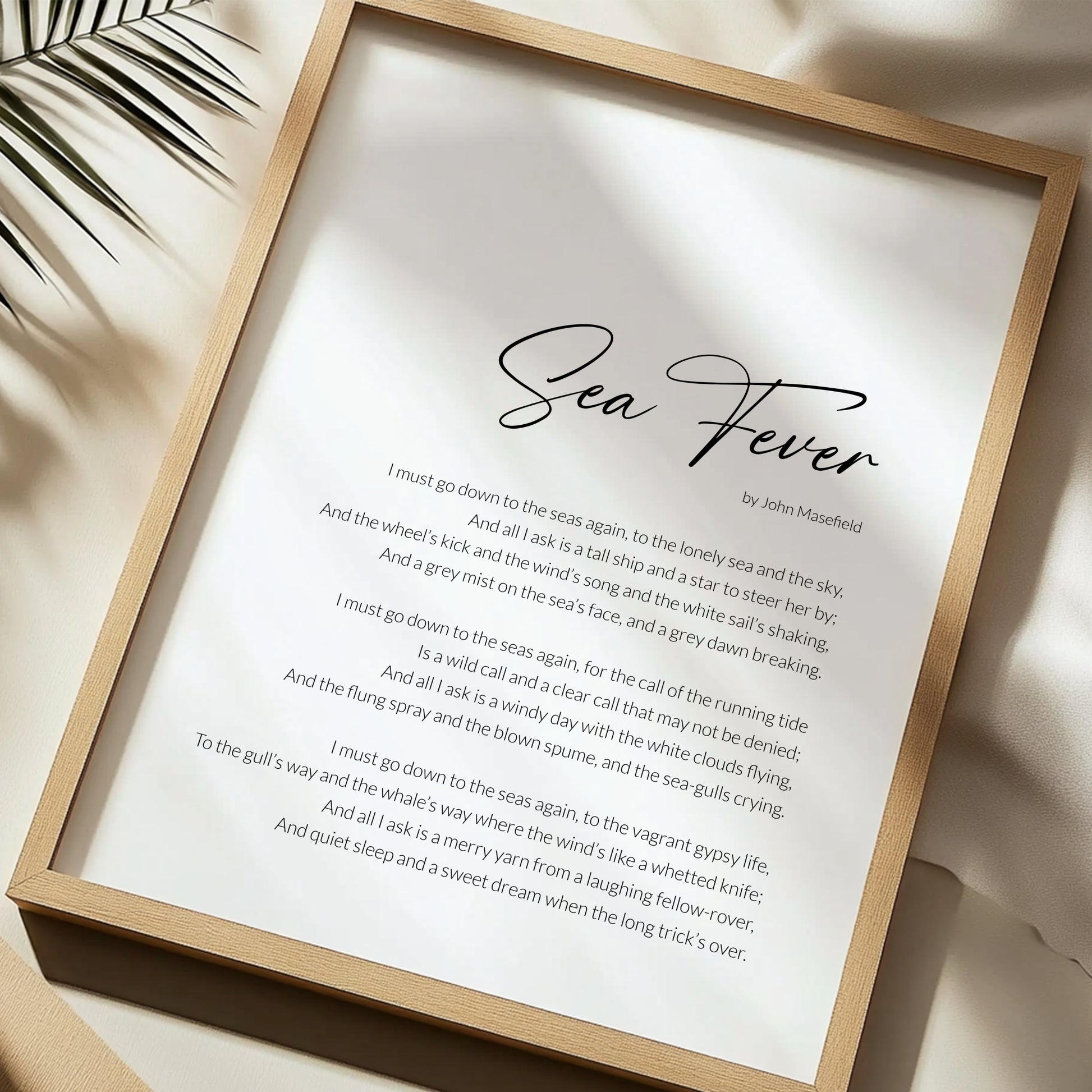 A serene and thoughtful addition to any home, this minimalist black-and-white print features Sea Fever, the beloved poem by John Masefield. The title is written in an elegant, gently swirling script that subtly echoes the movement of waves, paired with the poem itself in a lightweight sans serif font for a refined, timeless finish.