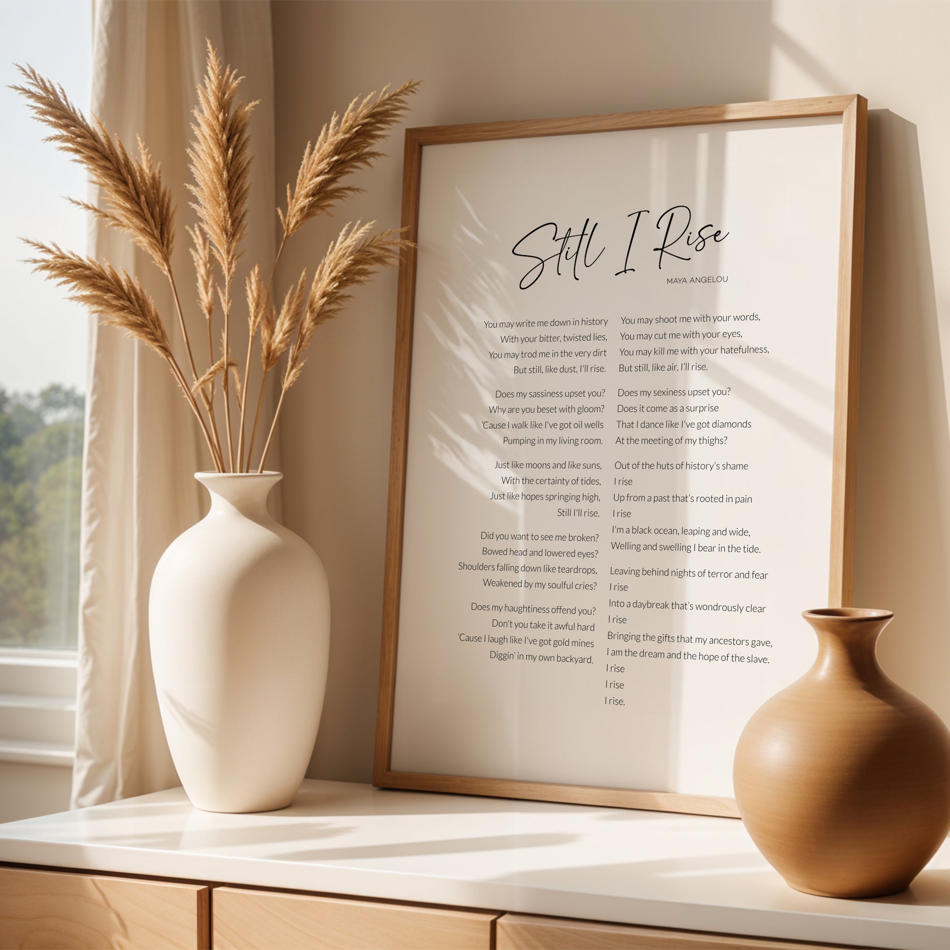 Celebrate strength, resilience, and empowerment with this elegant “Still I Rise” print, featuring Maya Angelou’s iconic poem. Known for its powerful message of courage and determination, this artwork makes an inspiring addition to any home or workspace.
