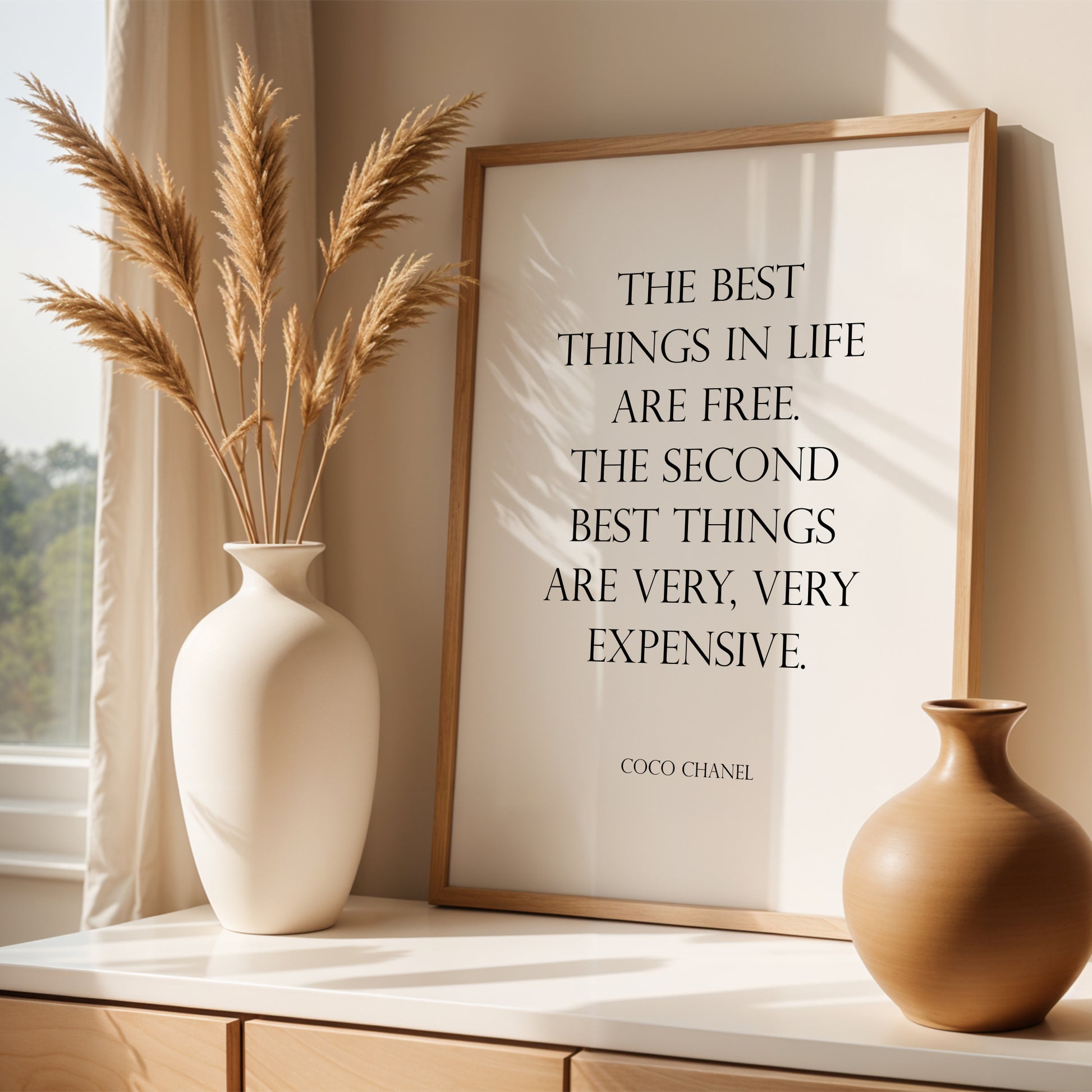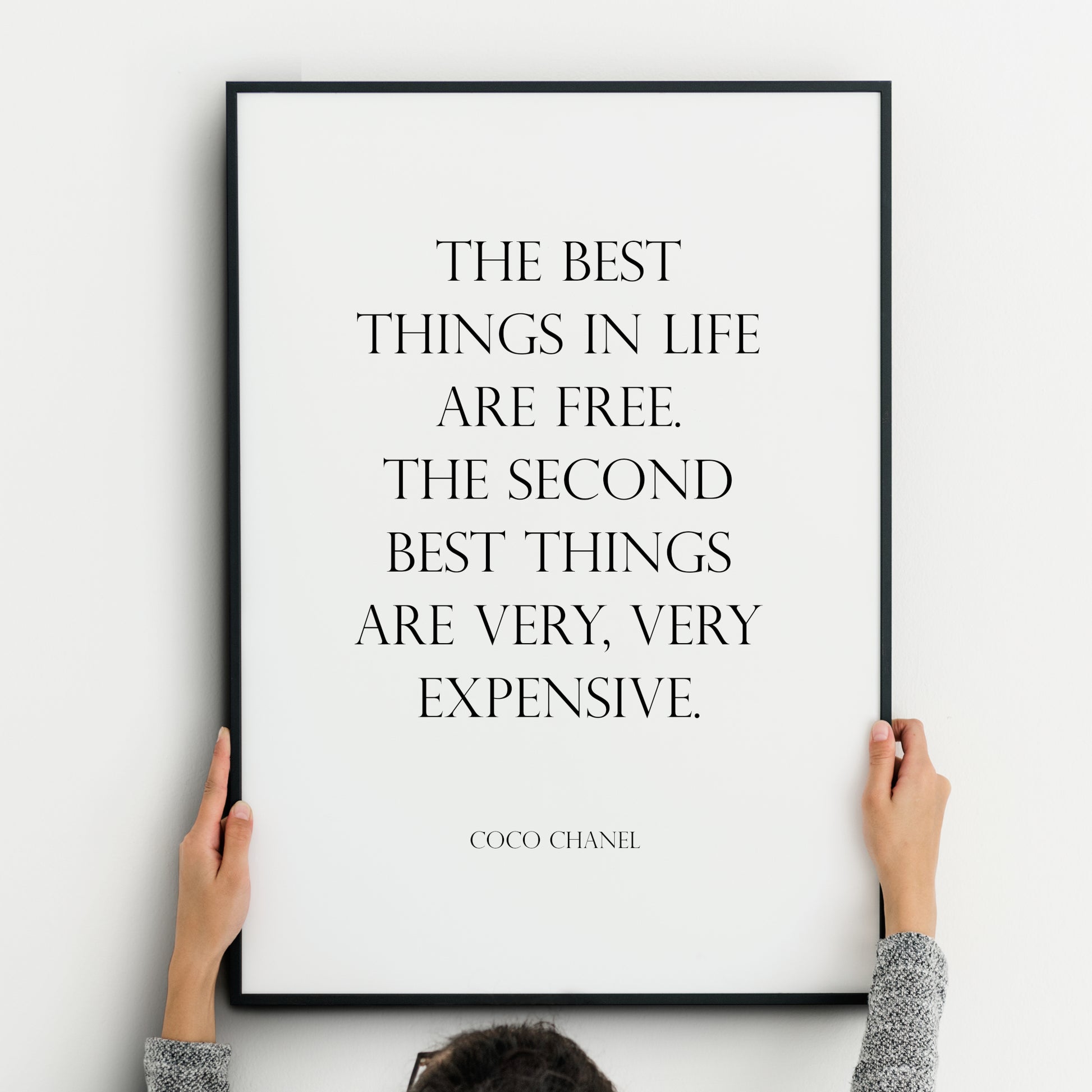 Add a touch of timeless elegance to your walls with this striking Coco Chanel quote print. Featuring her witty words, “The best things in life are free. The second best things are very, very expensive,” this piece blends sophistication with humour.