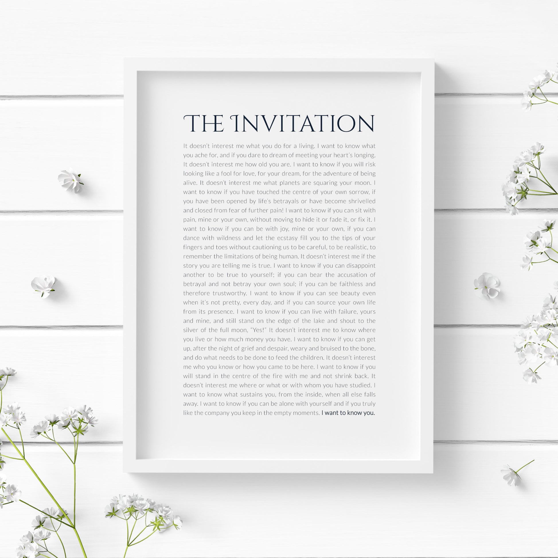 Bring depth, truth, and vulnerability into your space with this elegant typography print featuring "The Invitation" by Oriah Mountain Dreamer. A poetic reflection on authenticity, courage, and connection, this minimalist wall art adds soulful inspiration to any room.