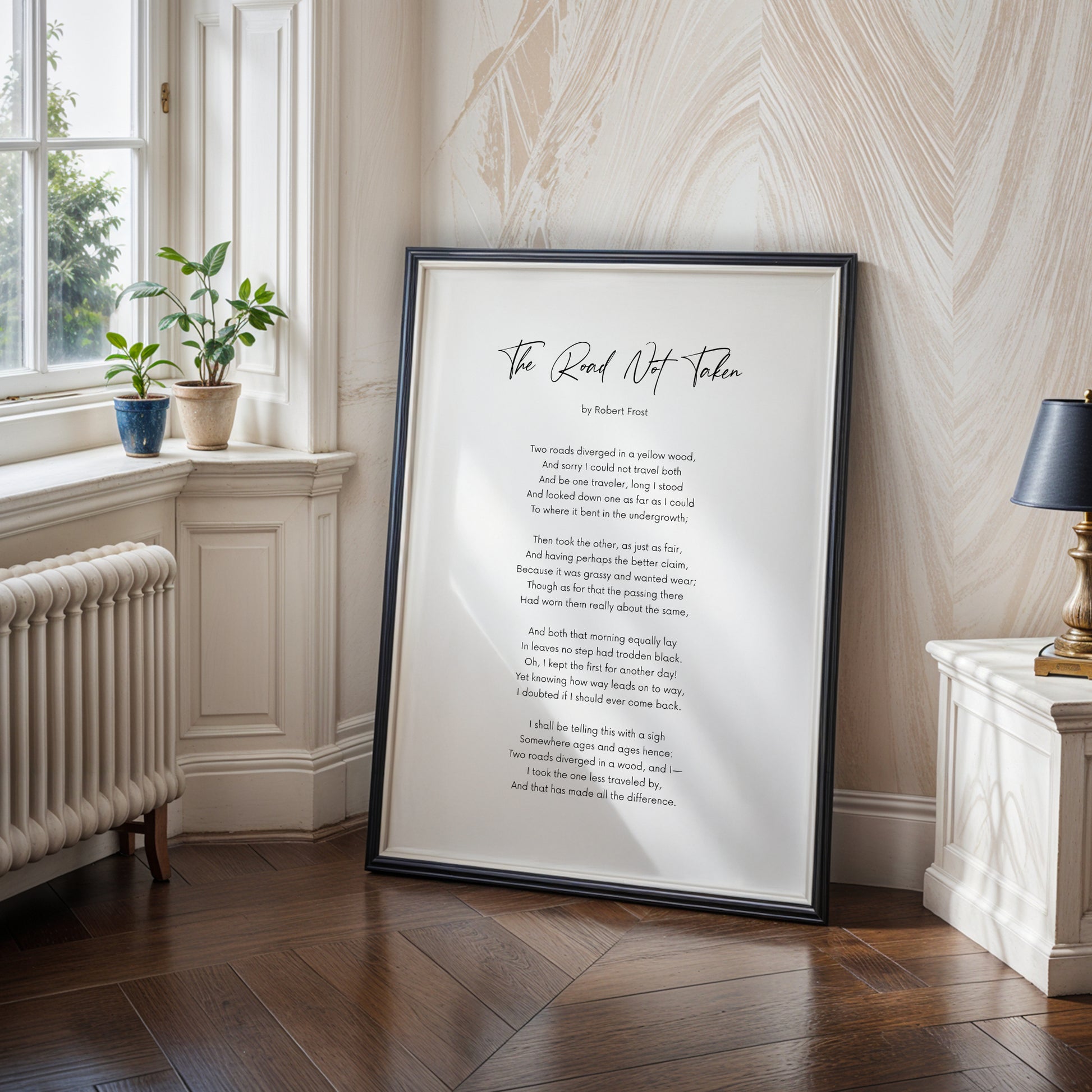 With delicate, modern typography and a simple black-and-white design, it’s a perfect addition to a reading nook, study, hallway, or anywhere that invites reflection. This literary art print makes a thoughtful gift for poetry lovers, graduates, or anyone standing at a crossroads in life - a gentle reminder that every decision shapes our story.