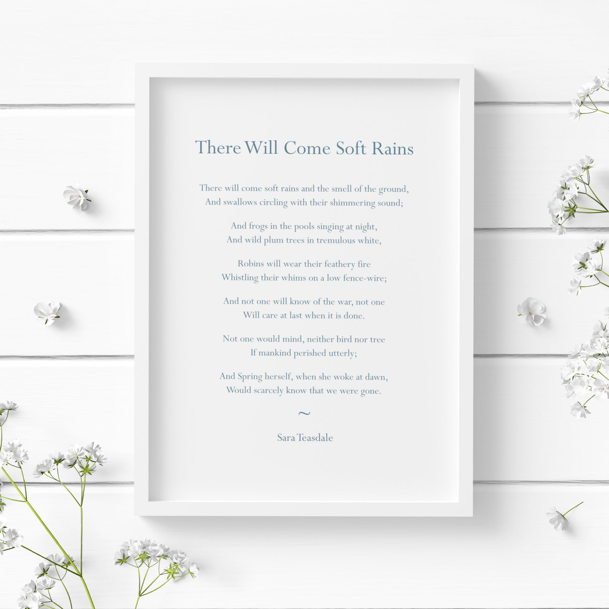 Sara Teasdale's beautiful poem "There will come soft rains" is paired with an abstract illustration to capture perfectly the gentle nature of this anti-war poem. The elegant typography and delicate artwork make this set a perfect addition to any literary collection or home decor. It is an ideal gift for poetry enthusiasts and those struggling to comprehend the world of today, offering a wonderful reminder of the enduring beauty and tranquility of nature amidst the chaos of modern life.