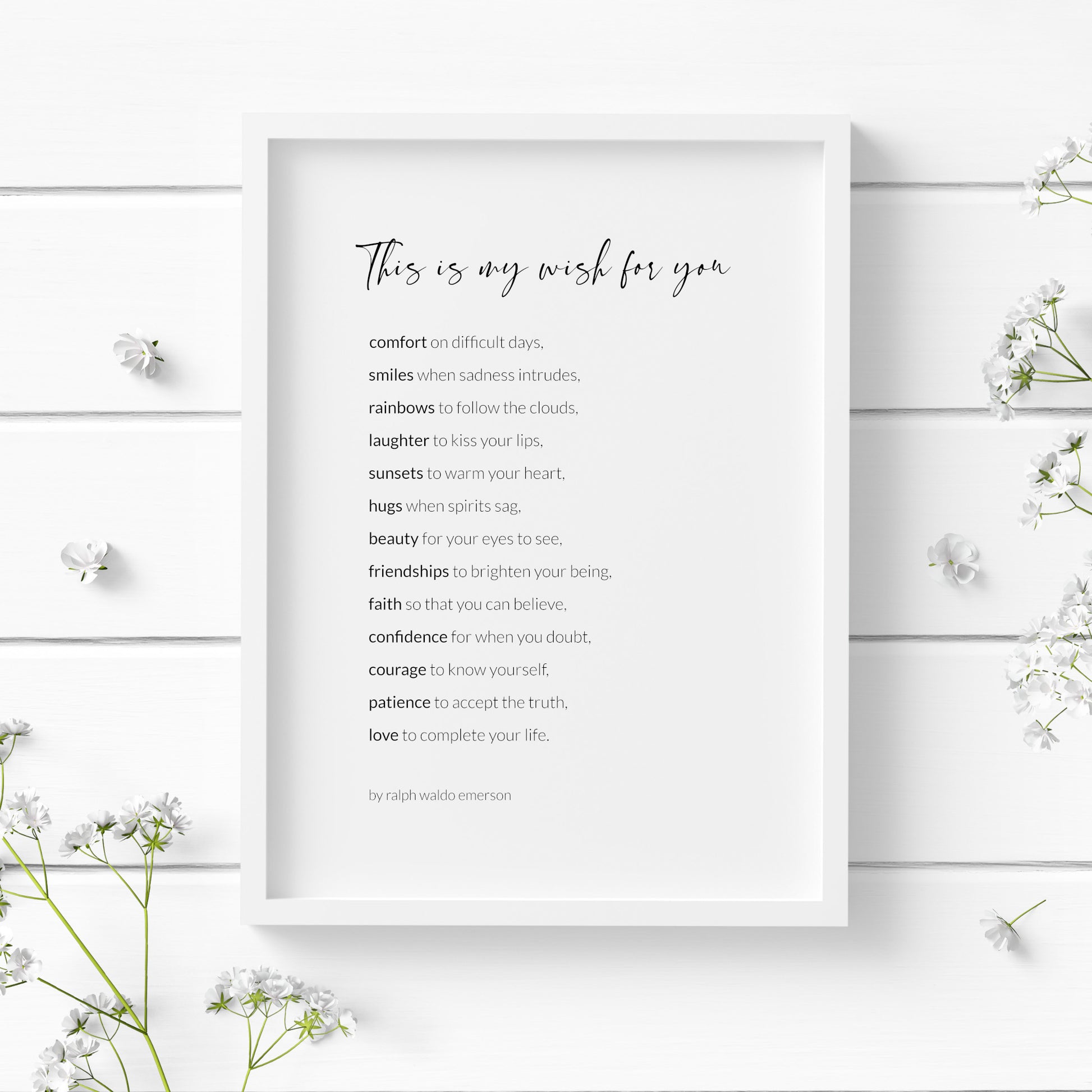 This beautiful print features the timeless poem "This Is My Wish For You" by Ralph Waldo Emerson. Elegantly presented to inspire and uplift, the thoughtful design and typography combine to make it the perfect addition to any home or office space. Also ideal as a gift or a personal keepsake, this print is the perfect reminder of the bond shared between loved ones.