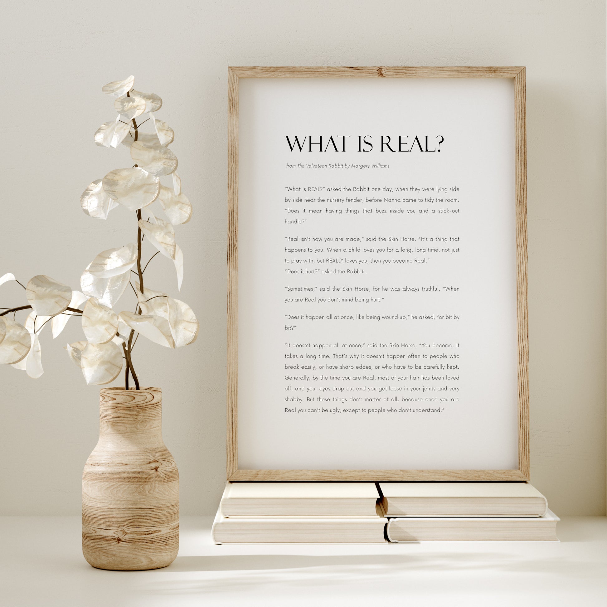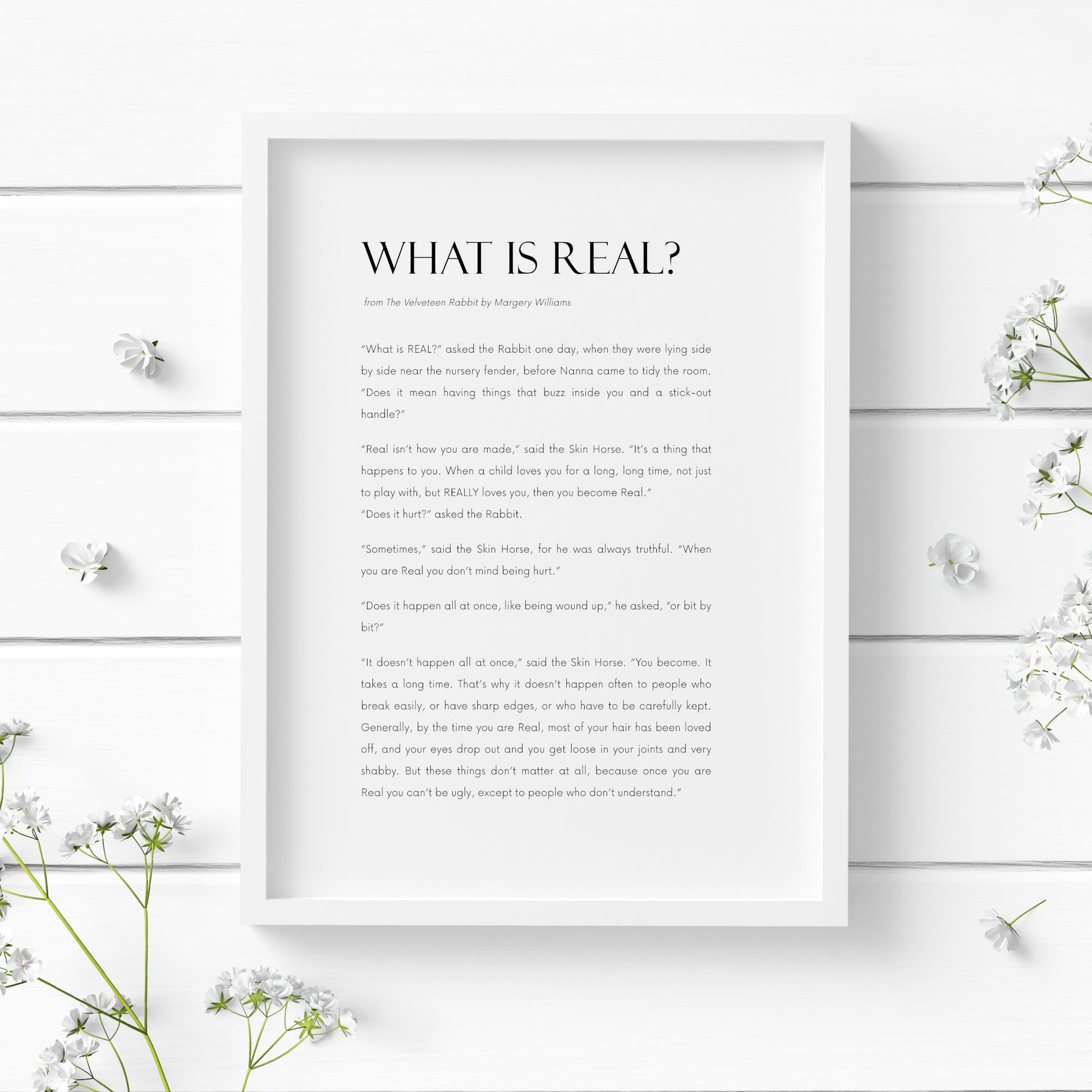 This elegant print features the beloved “What is Real?” passage from The Velveteen Rabbit by Margery Williams. A touching reflection on love, authenticity, and what it means to truly become real, this design pairs contemporary typography with minimalist styling for a serene, meaningful display.