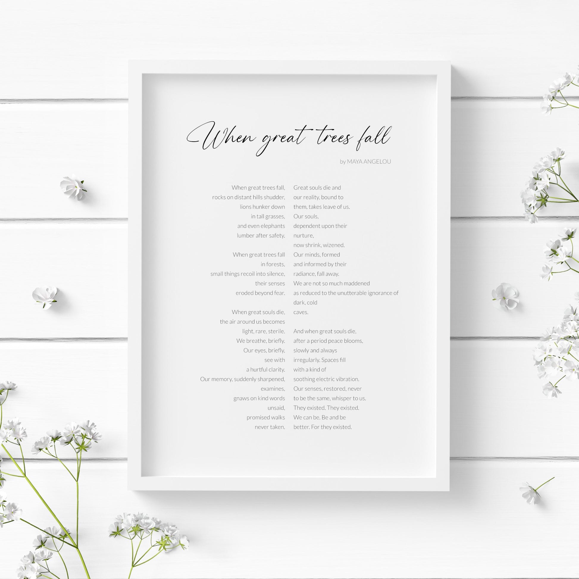 When Great Trees Fall by Maya Angelou is a timeless poem that speaks to the depth of loss, remembrance, and renewal. This beautifully presented print captures her moving words with simplicity and grace, making it a stunning addition to any home or workspace.