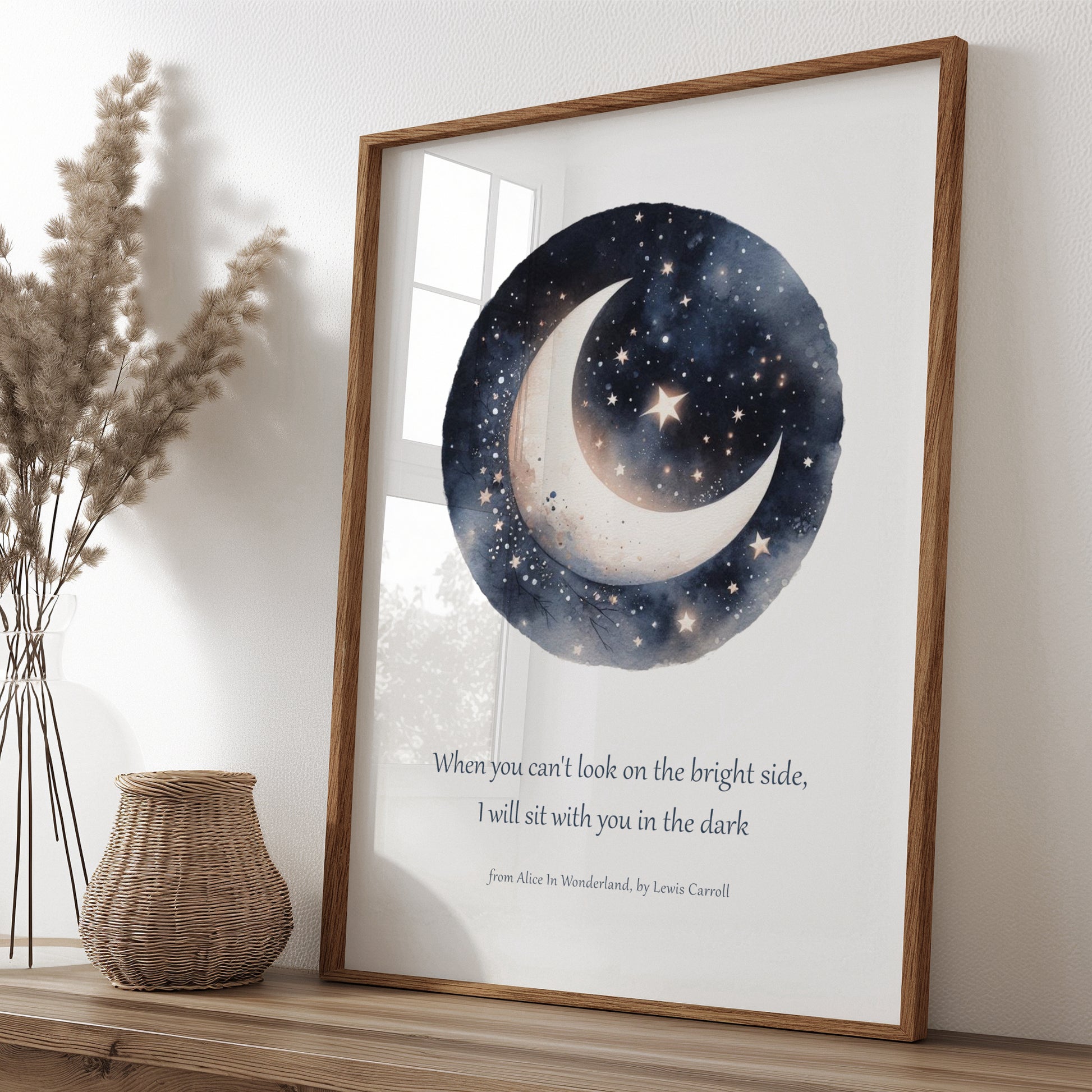 A tender message of comfort and companionship, this unframed art print pairs one of literature’s most heartfelt quotes with a delicate moon and stars watercolor illustration. It’s a beautiful reminder that even in difficult times, love and friendship shine softly in the dark.