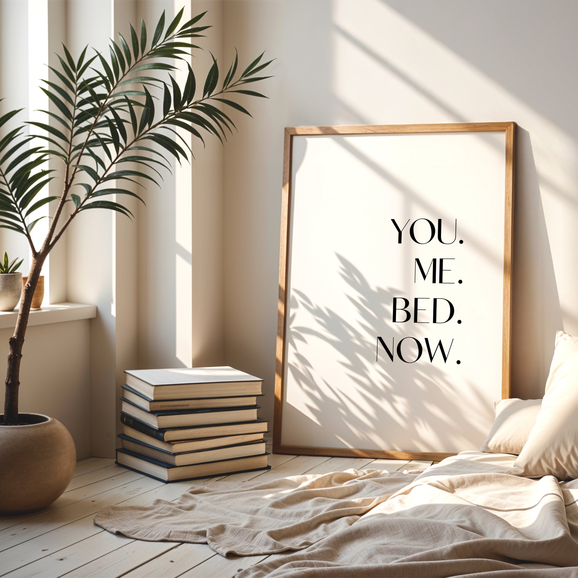 Make a statement with this bold and cheeky "You. Me. Bed. Now." print - the perfect blend of minimalism and playful charm. Featuring sleek black typography on a crisp white background, this modern design adds a touch of style and intimacy to any couple’s bedroom.