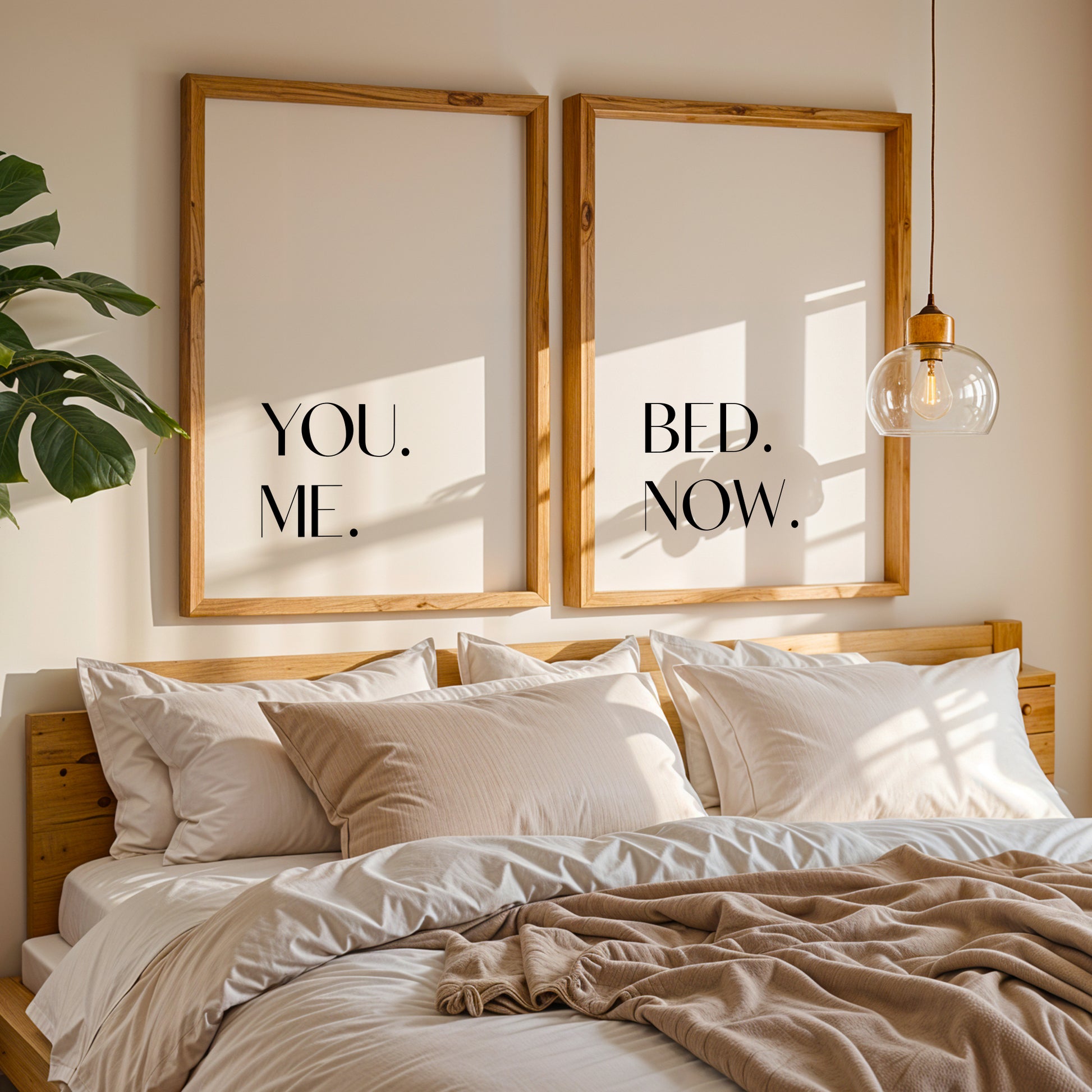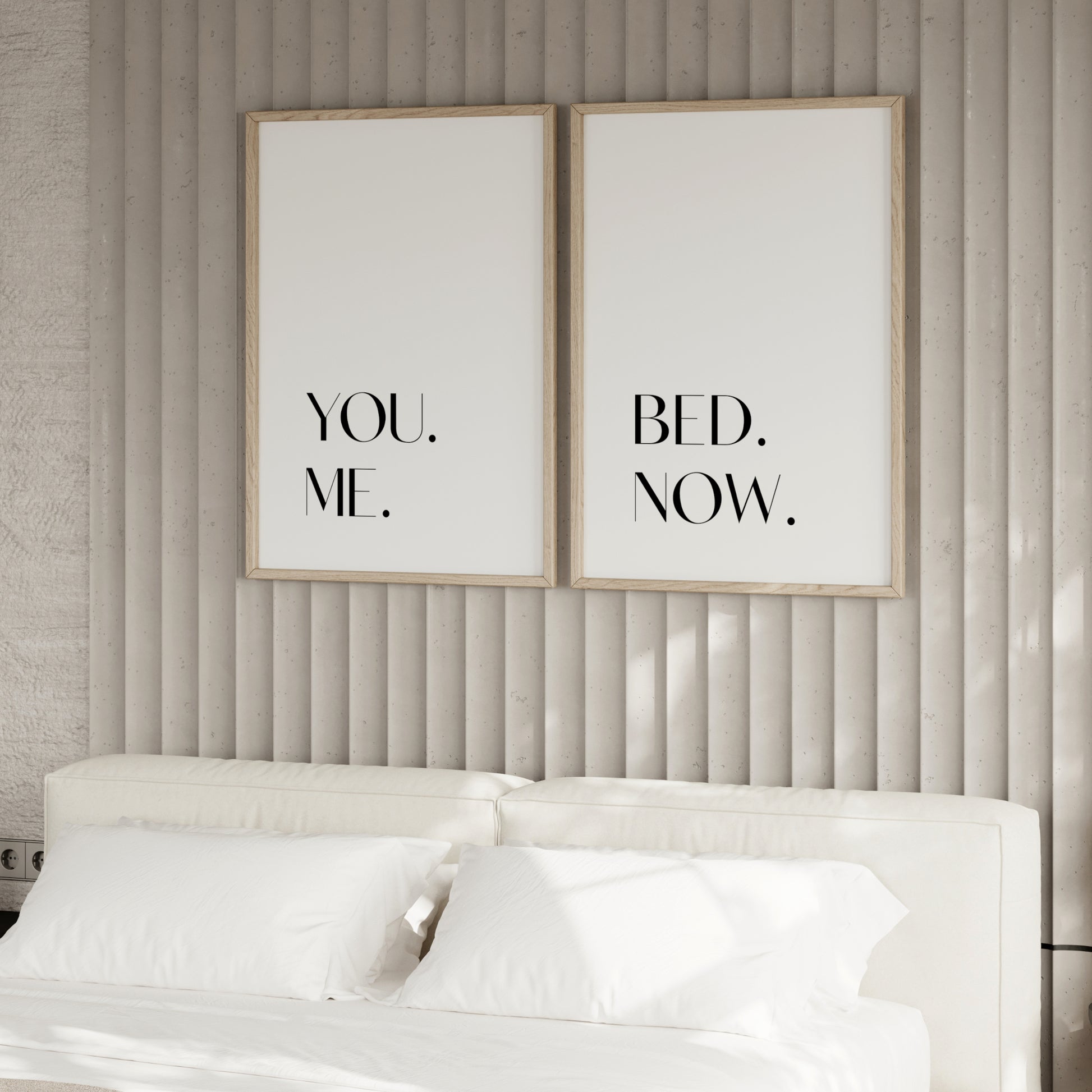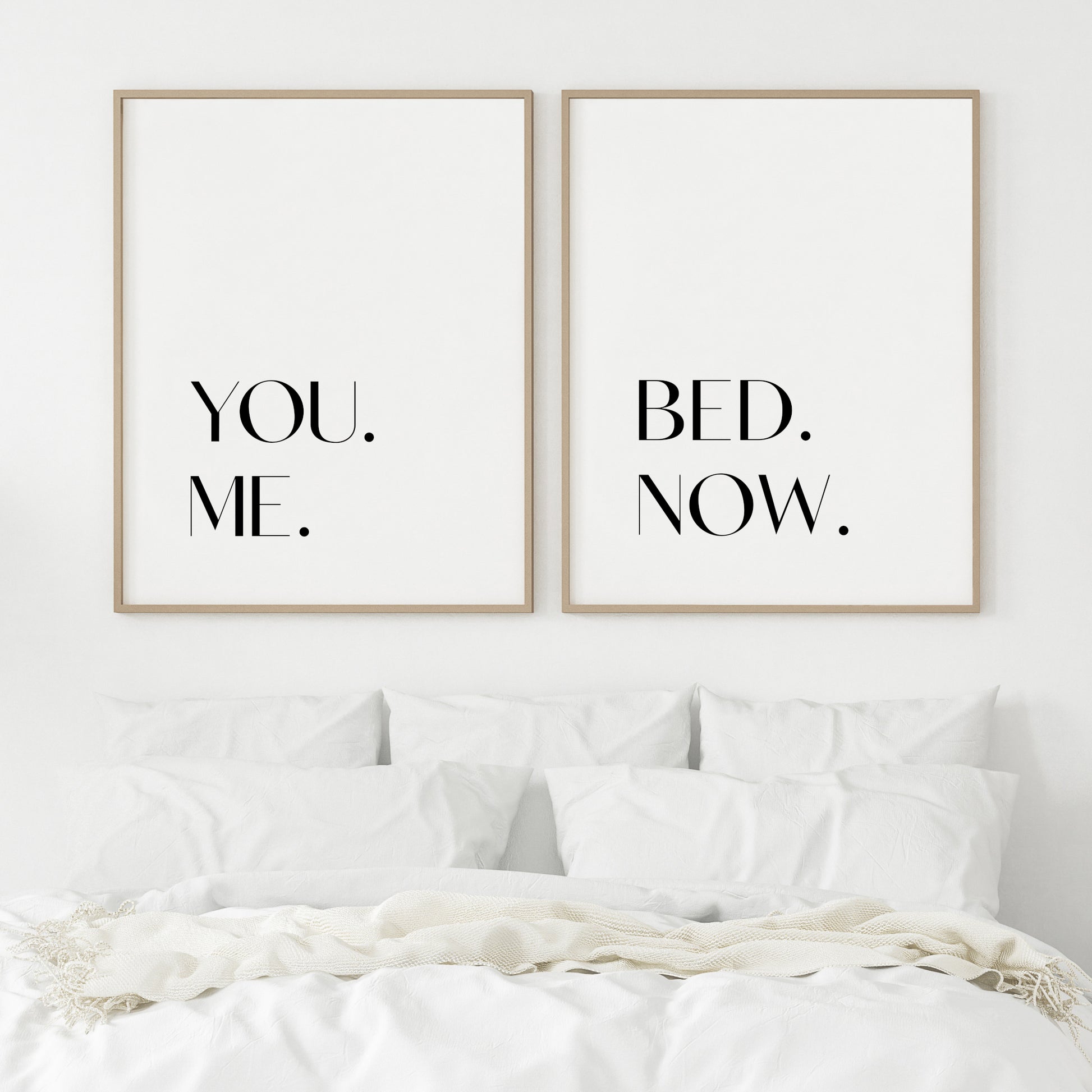 You Me Bed Now! This playful set of two typography prints will add personality and intimacy to your master bedroom decor. The clean, modern typography and simple stacked layout, create a striking visual impact, while the minimalist black-and-white design keeps the look sophisticated.