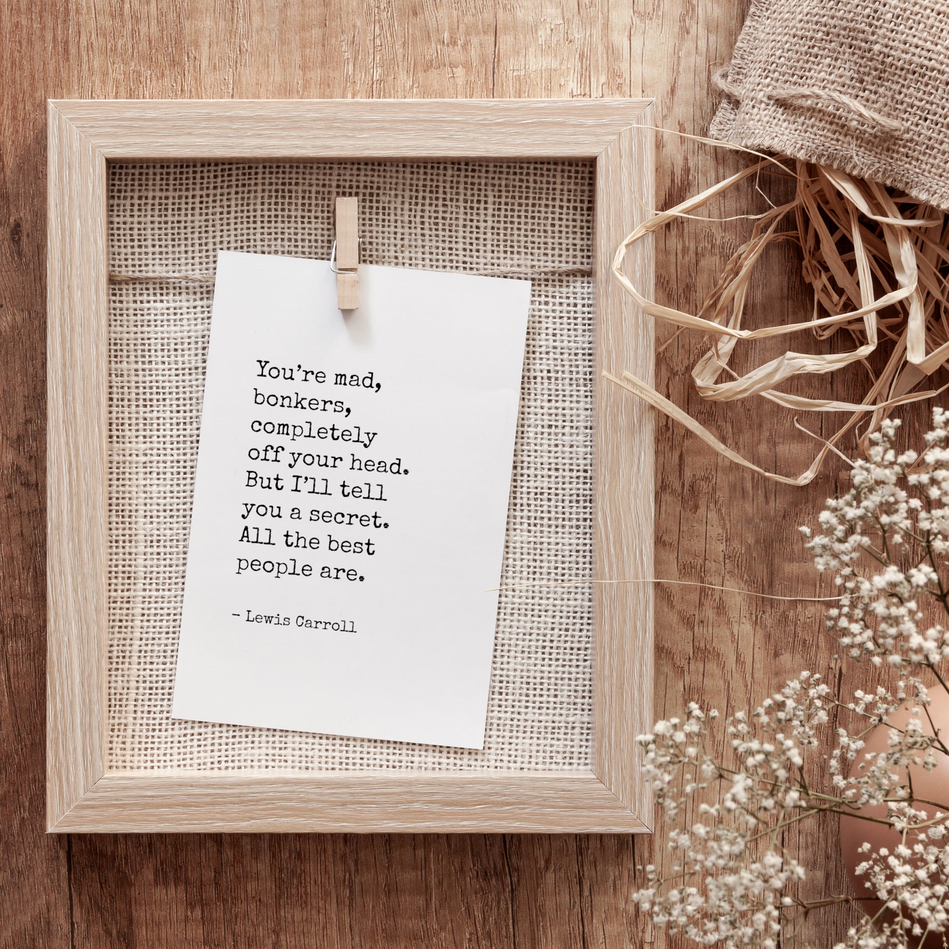 Quote reads "You’re mad, bonkers, completely off your head. But I’ll tell you a secret. All the best people are. - Lewis Carroll".